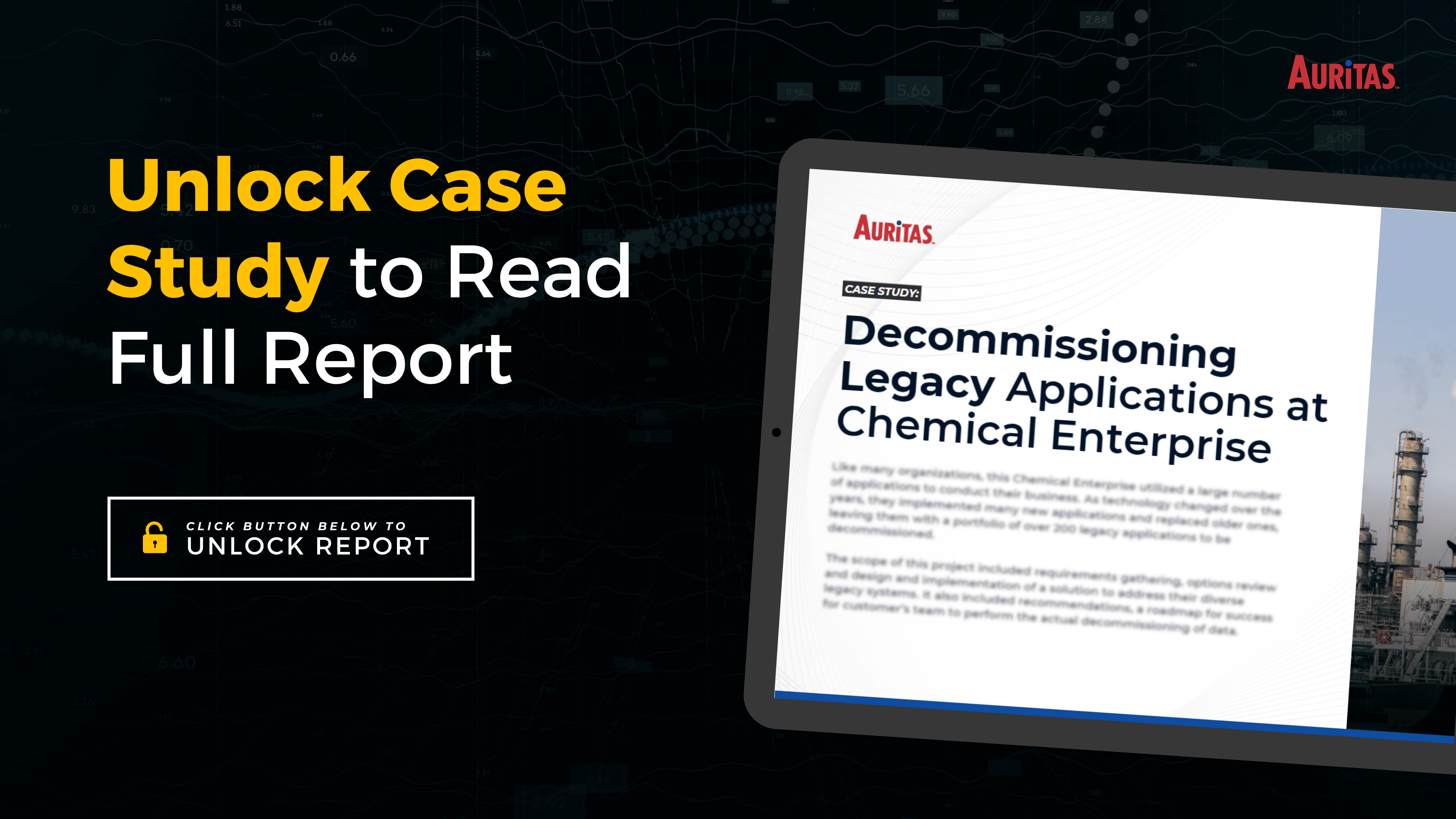 Like many organizations, this Chemical Enterprise relied on a large number of applications to support its operations. Over time, as technology evolved, new applications replaced older ones, leaving them with a portfolio of over 200 legacy systems that needed decommissioning. However, due to data retention and compliance requirements, the data within these legacy applications had to remain accessible for retrieval. To address this challenge, the objective was to partner with trusted enterprise data and document management firm, Auritas, to design and implement a repeatable data decommissioning capability, not only for the current legacy applications but also for any future systems.